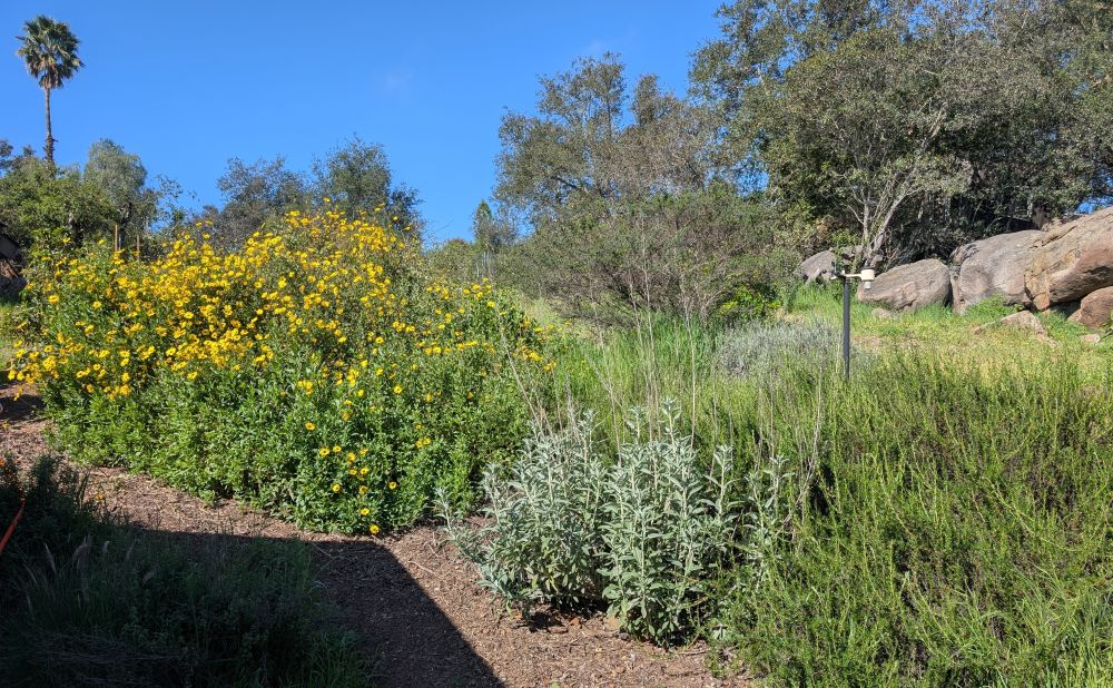 Coast sunflowers start the year in early winter, then ceanothus in late winter and early spring, then lavender in early spring too. White sage in late spring to early summer, then oregano and buckwheat most of summer and fall.