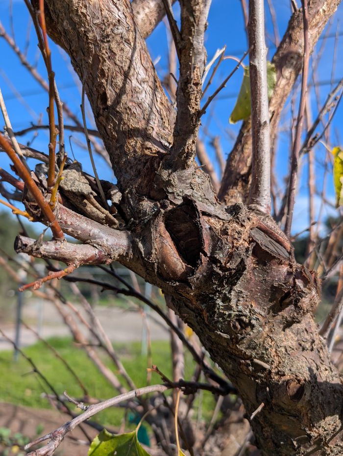 One possibility is that my location in the foothills of San Diego County, or Southern California more generally, is not conducive to this fungus and its claimed pathogenicity. In another UC resource, it is implied that Eutypa infection requires more rainfall than we receive. “In wet winter areas” apricots should only be pruned in summer, says this page. Is my yard not wet enough? Studies have found that Eutypa spore production occurs in locations with more than 13.5 inches of rainfall, says this page. I get more than that, but not much more. My average is 15-16 inches.