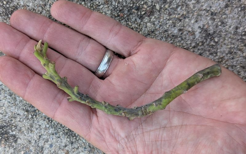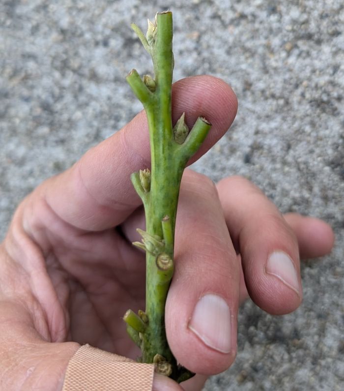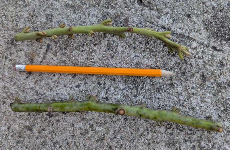 Strictly speaking, the scion only needs one good bud plus enough length below that bud for a cut that will be connected to the stock. But it’s usually best to have two or three good buds on a scion, if possible. And it’s best to have a straight section without too many leaf stubs below those buds where you can make a cut of about three inches long.