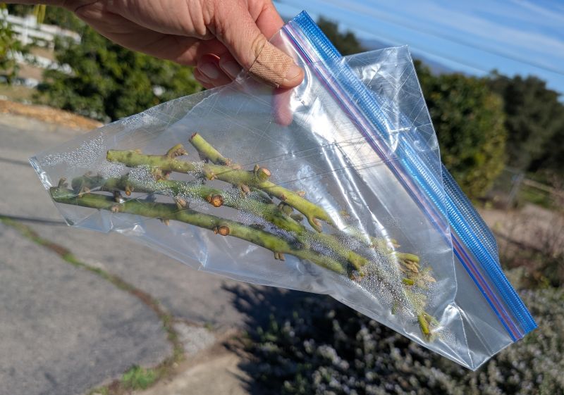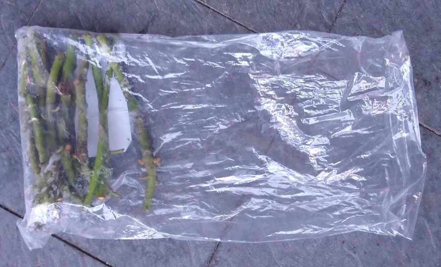 Plastic bags that are thin like grocery store produce bags work fine. Roll the bag up in order to make at least a partial seal; remember that the point of the bag is to prevent the scions’ dessication.