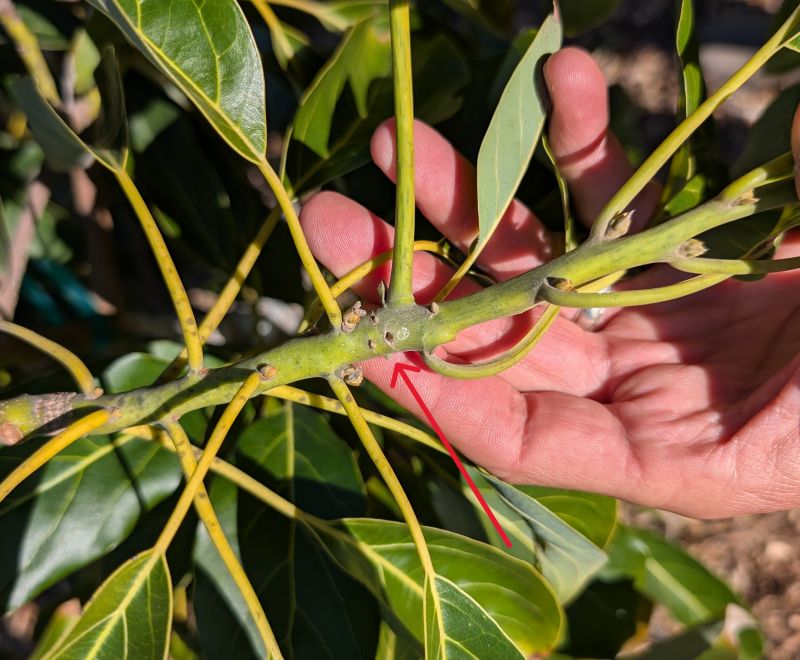 The parts of the scion that will grow are the buds. This is why an avocado scion is also called budwood. The buds are located just above where each leaf attaches to the branch (the “axil”).