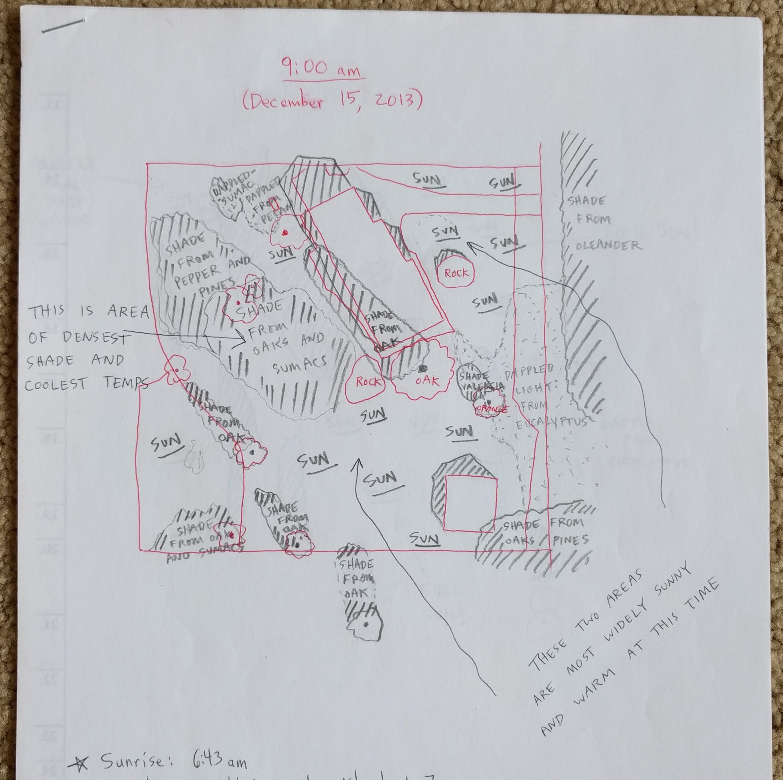 The land is on a gentle slope that faces the morning sun, east, but whose border reaches the top of the slope, such that there is no higher hill casting an afternoon shadow over it. Almost the entire acre gets full sun all day, all year long, except for a few spots near large oak trees.