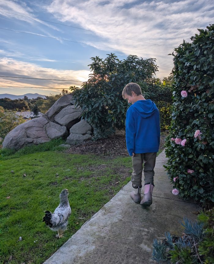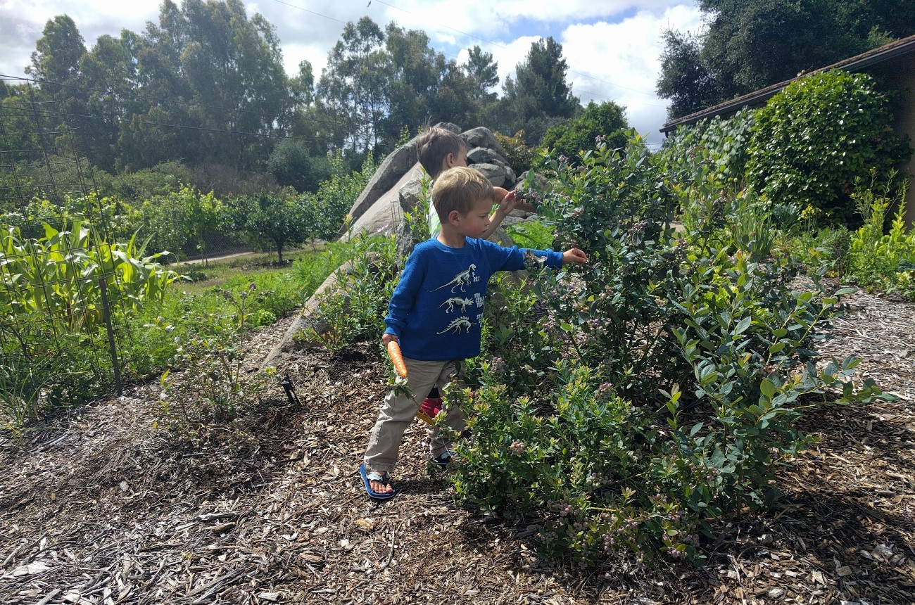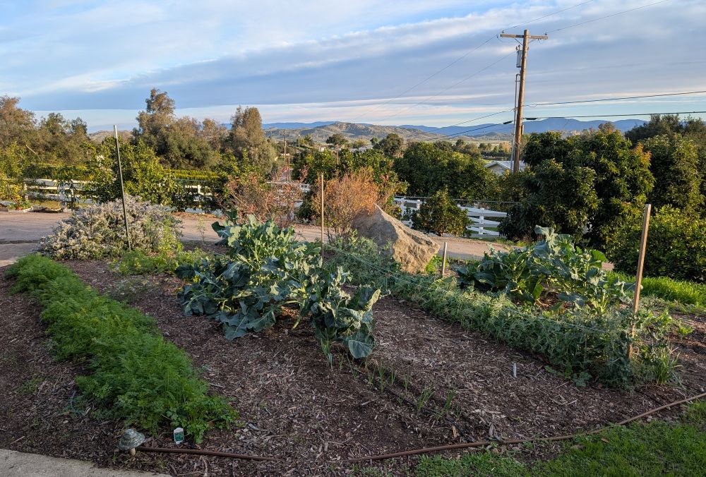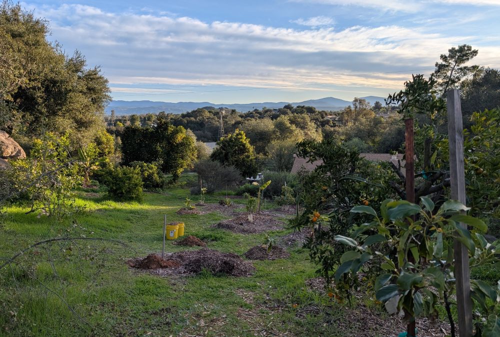 The yard is 1.3 acres. This has been more than enough space to fulfill my goals of growing almost all (about 80 percent) of my family’s fruits and vegetables, plus chicken eggs, plus lots of extra avocados. I still leave approximately half of the property unirrigated and wild, covered with mostly native plants – oaks, sumacs, buckwheat, chamise.